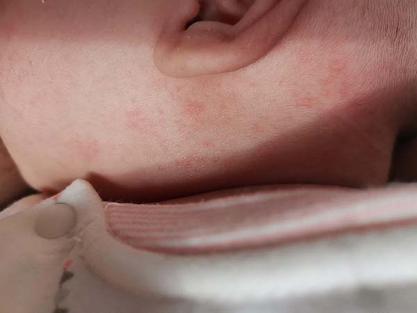 它在瘦嬰兒中更為常見。表面、軀幹、四肢有不同大小的淺紅色或深紅色斑點,表面有密集的小腫塊和頭皮屑,如病程長,面板損傷部位面板增厚,可有抓痕和血痂。